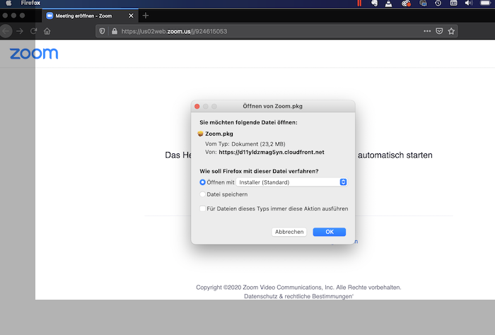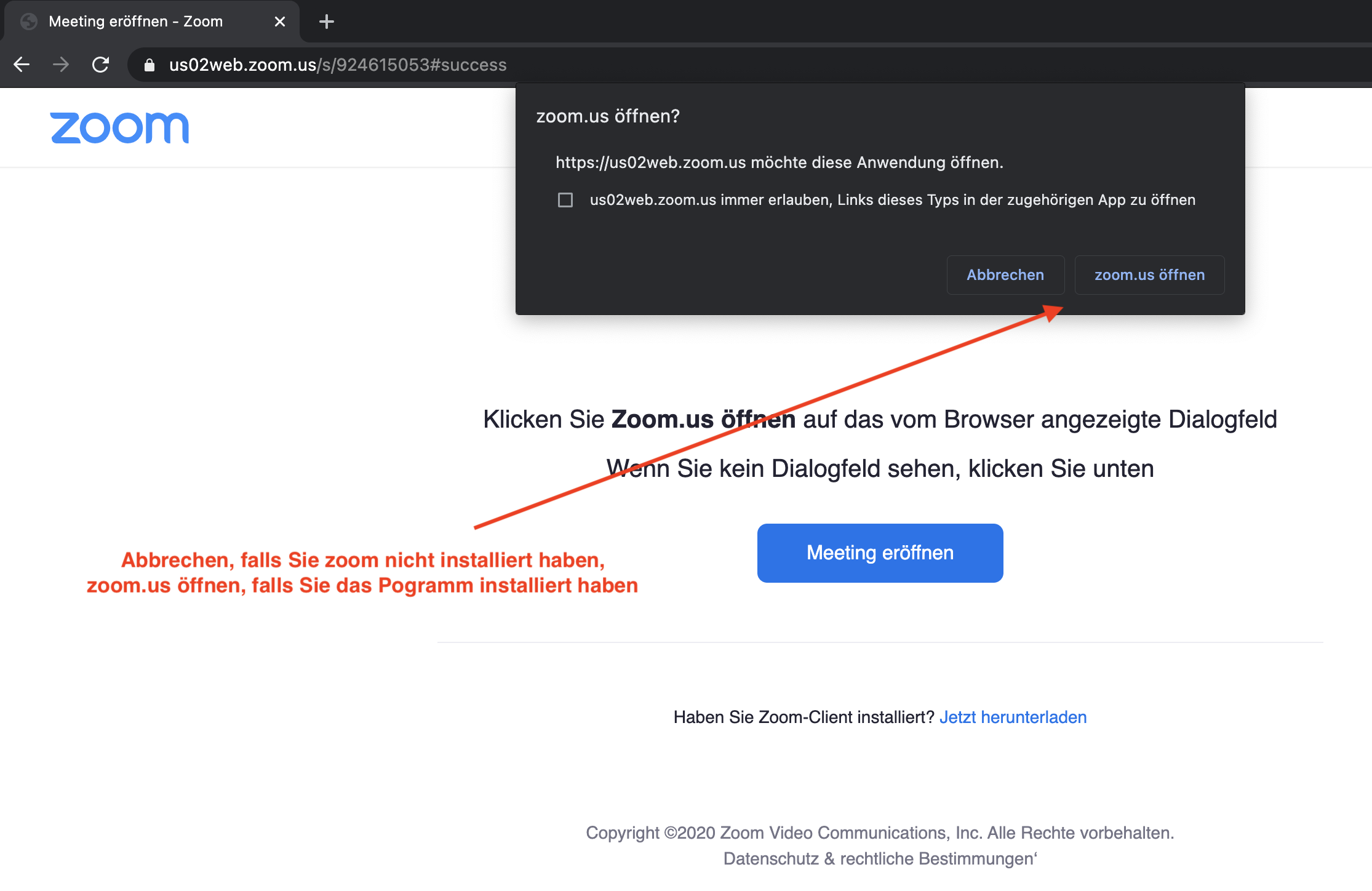 2. Sie bekommen nun eine Meldung, die Sie fragt, ob zoom geöffnet werden darf. Bestätigen Sie dies mit „zoom.us“ öffnen: