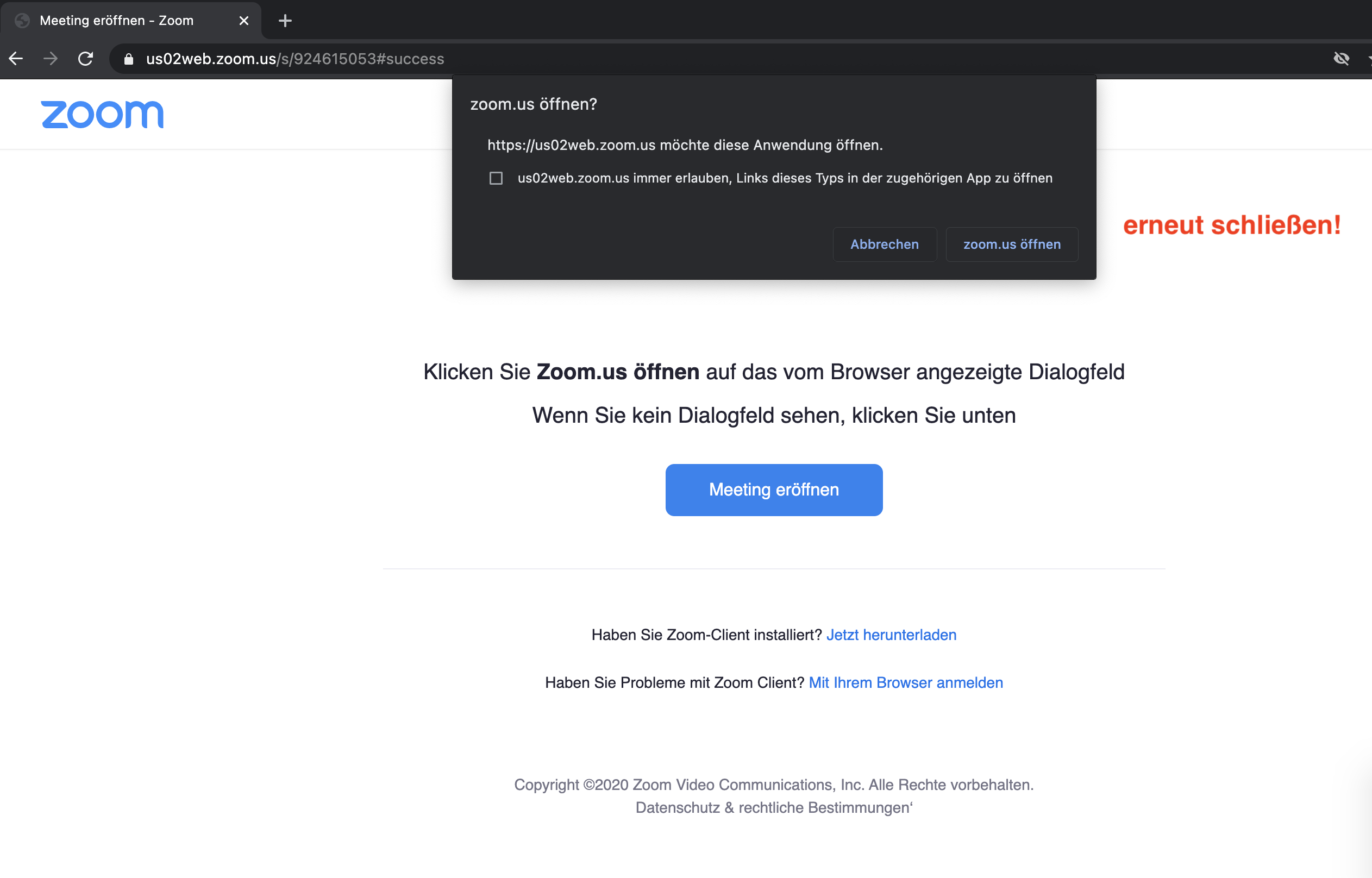 3. Nun müssen Sie auf „Meeting öffnen klicken“, es öffnet noch einmal das Pop-Up-Fenster, das sie bitte erneut schließen: