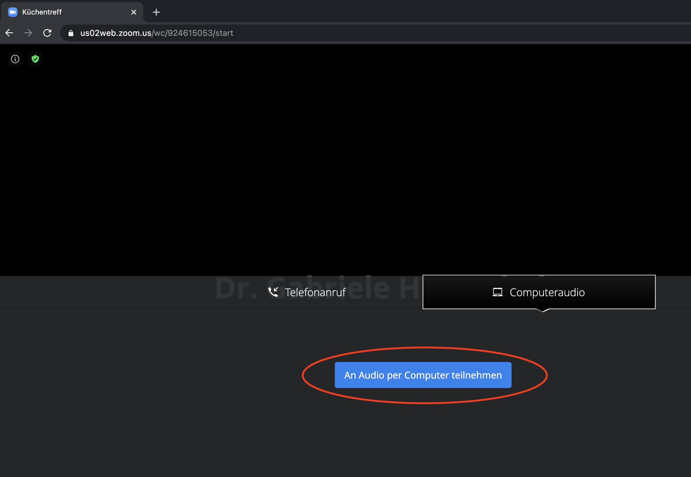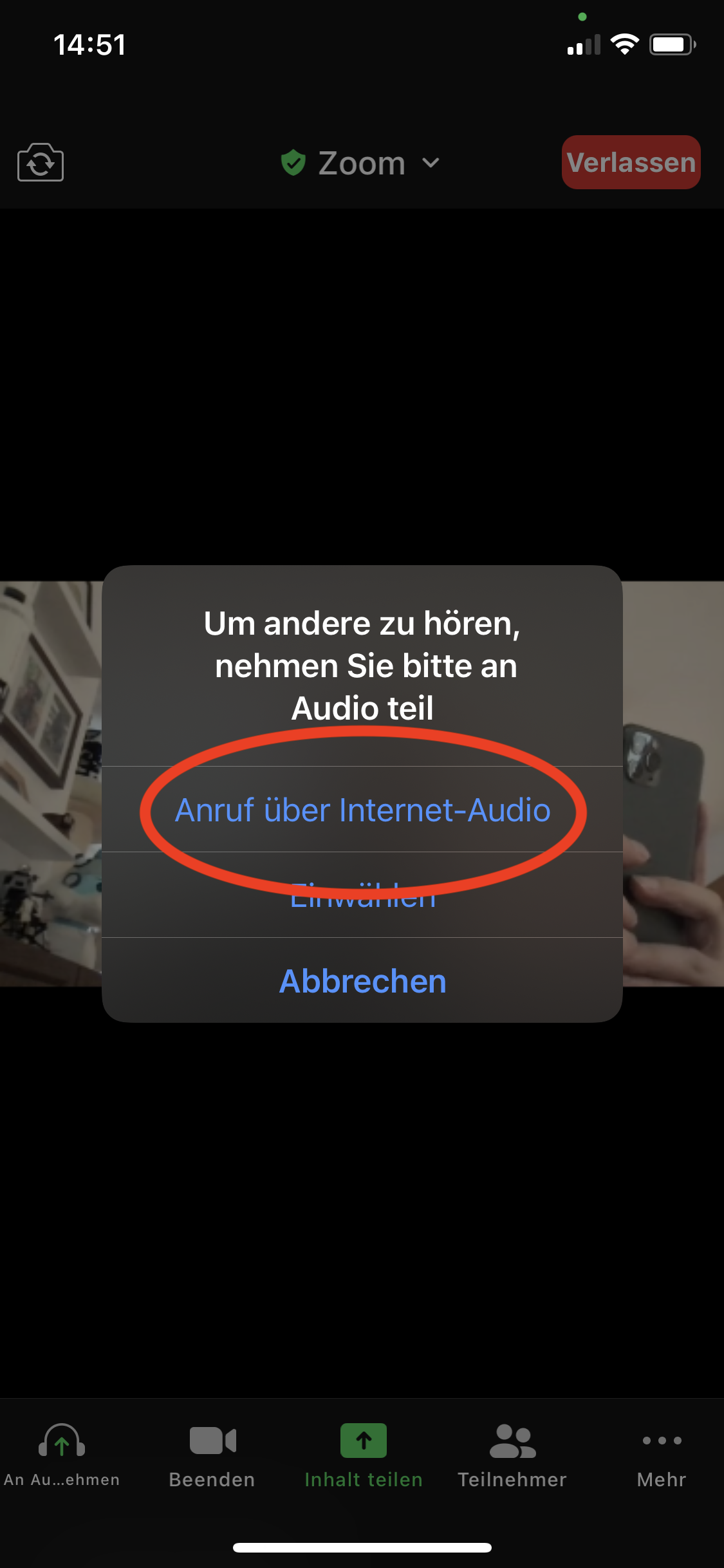 5. Danach sind Sie schon im Meetingraum. Damit Sie die anderen hören können und damit Sie sprechen können müssen Sie Ihr Audio noch verbinden. Hierfür bitte „Anruf über Internet-Audio wählen: