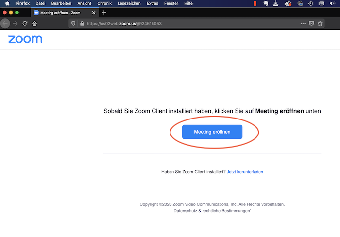 3. Klicken Sie erneut auf „Meeting eröffnen“: