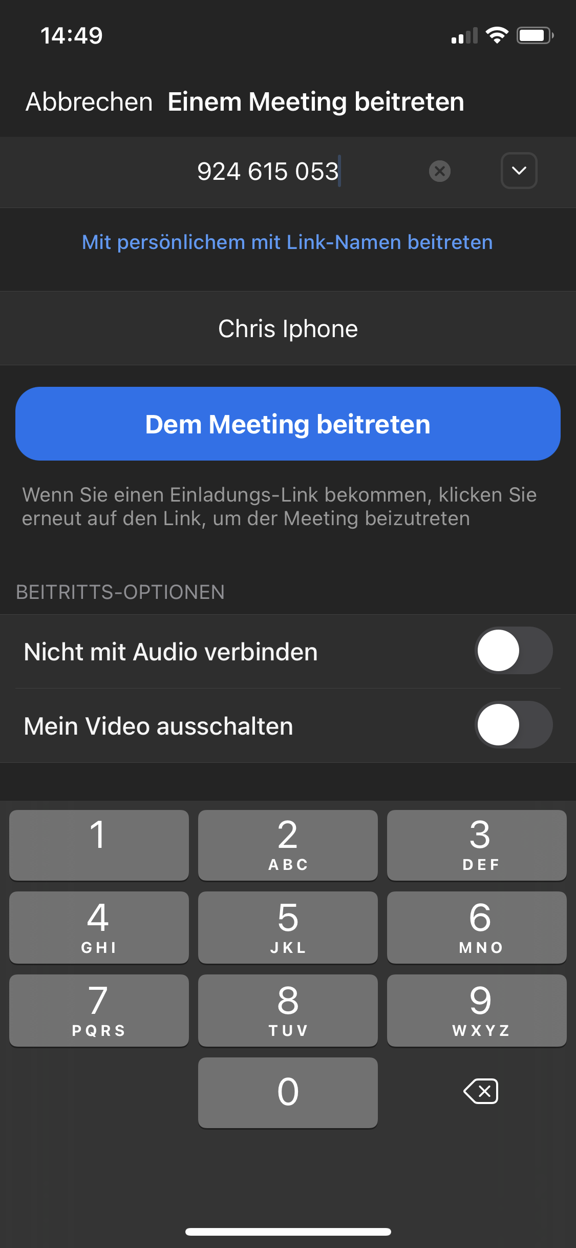 3. Geben Sie als nächstes die Meeting-ID ein, die Sie erhalten haben und klicken Sie danach auf „Dem Meeting beitreten“: